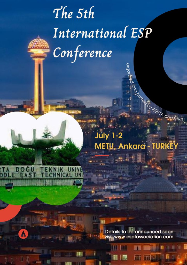 The 5th International ESP Conference on July 1-2, 2022 at METU (Middle East Technical University), Ankara, Turkey Details to be announced soon. Share this: Click to share on X (Opens in new window) X Click to share on Facebook (Opens in new window) Facebook Like Loading...